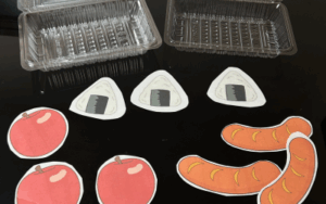 音楽をよく聴いて、どの具材の音楽かを考えてお弁当箱に入れていきます。